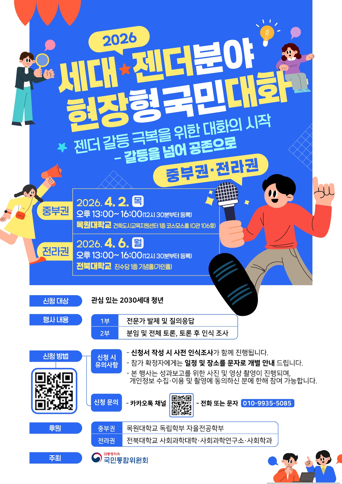 위원회[행사공지] 「2026 세대·젠더 분야 중부권, 전라권 현장형 국민대화」 사전등록 안내