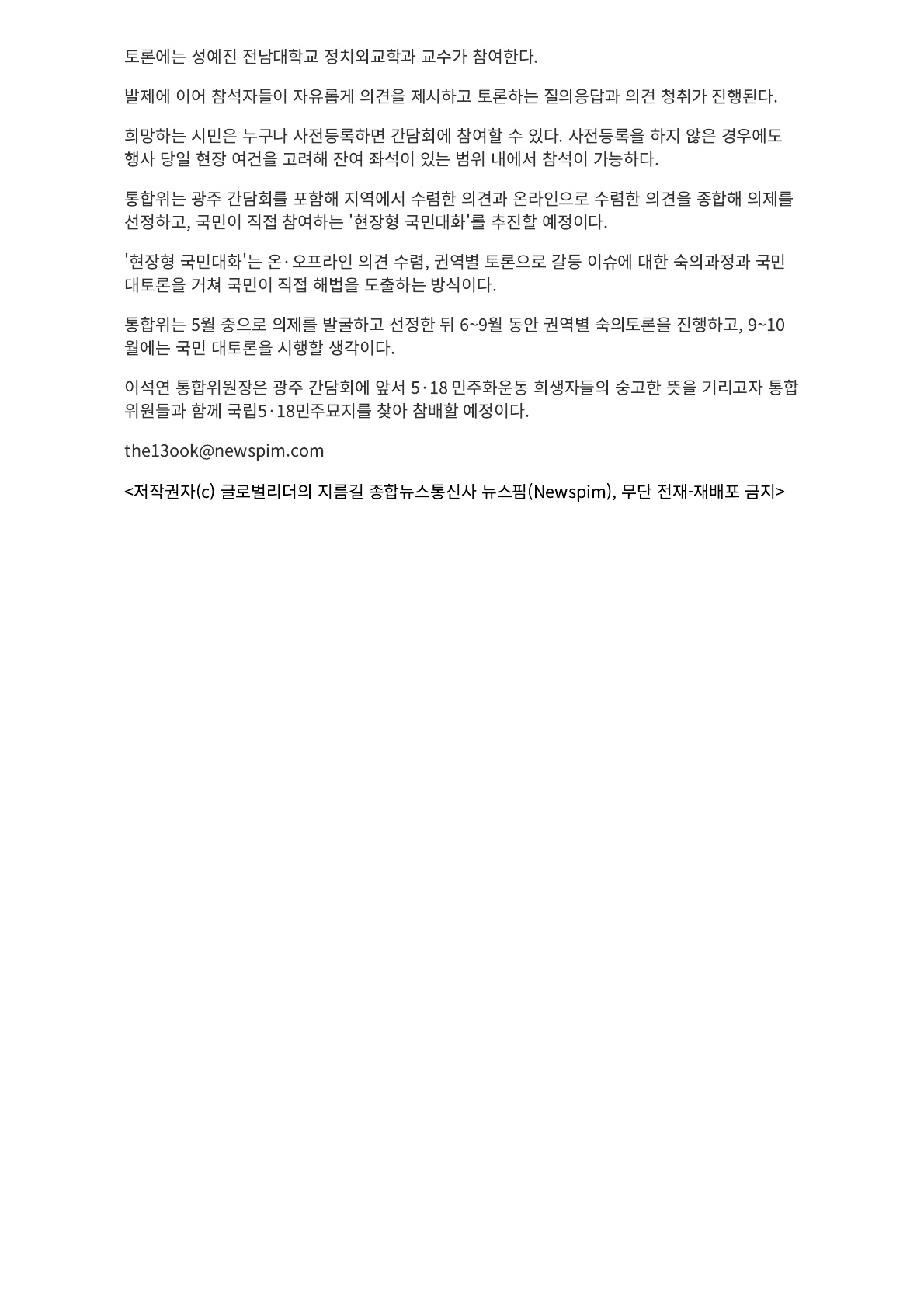 국민통합위원회, 국민과 함께하는 광주 현장 경청 간담회 개최