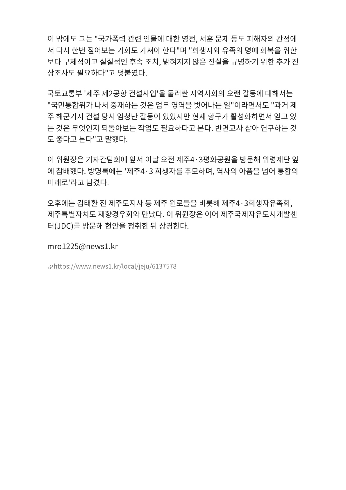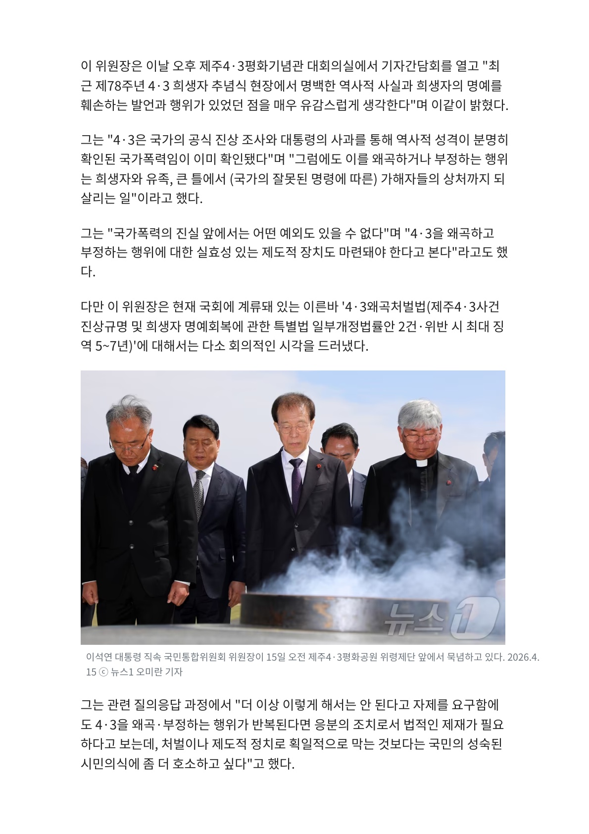이석연 통합위원장 "4ㆍ3은 '국가 폭력'…왜곡ㆍ부정 행위 자제해 달라"