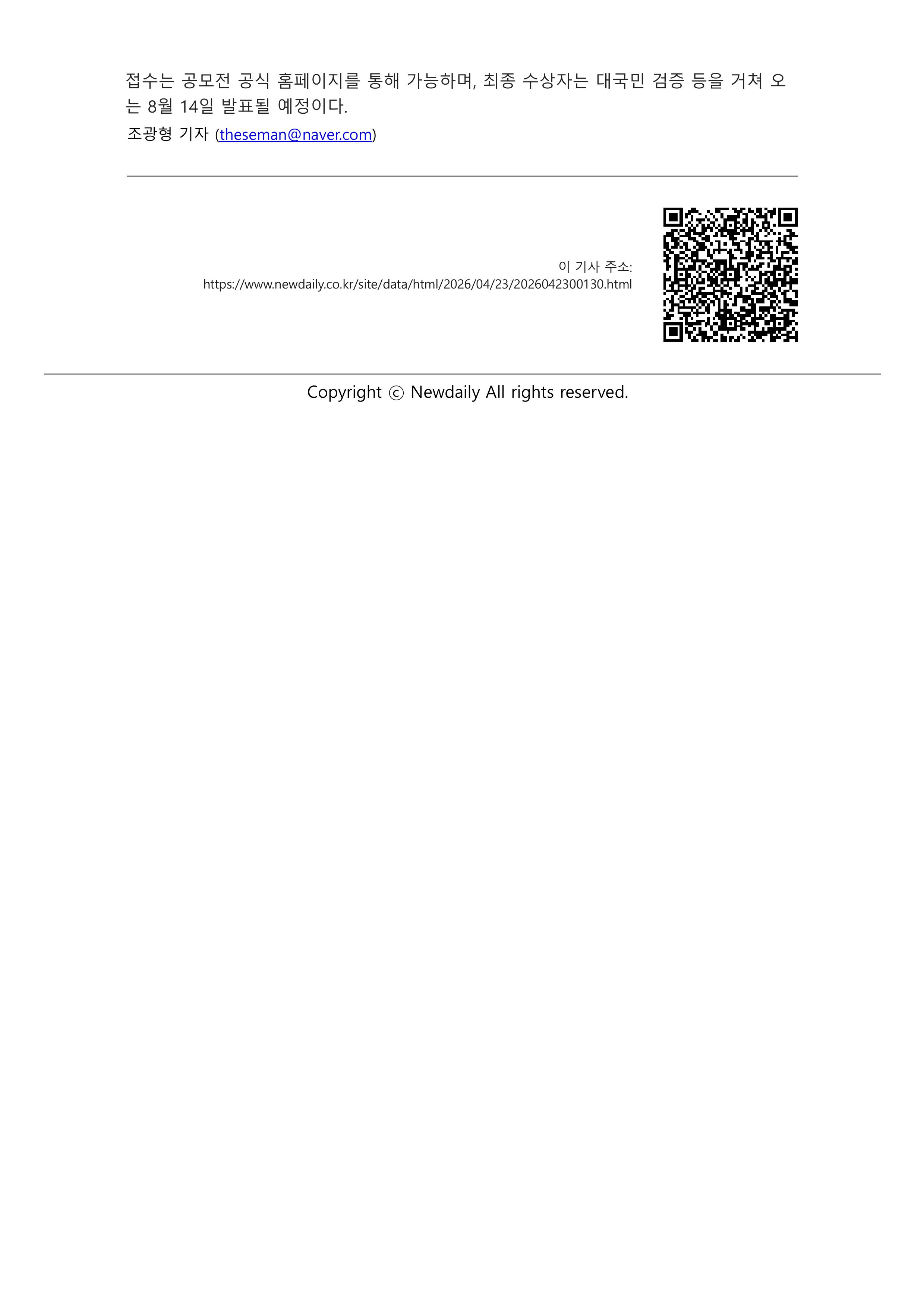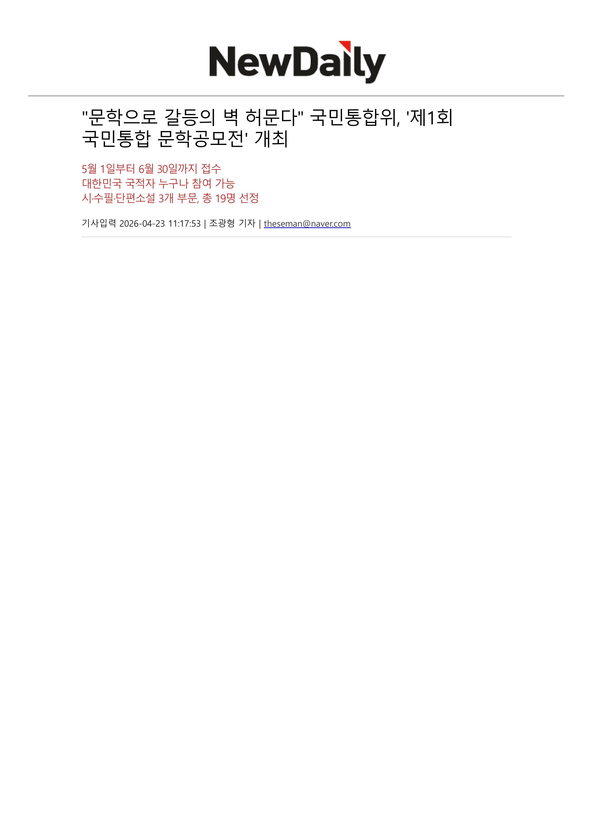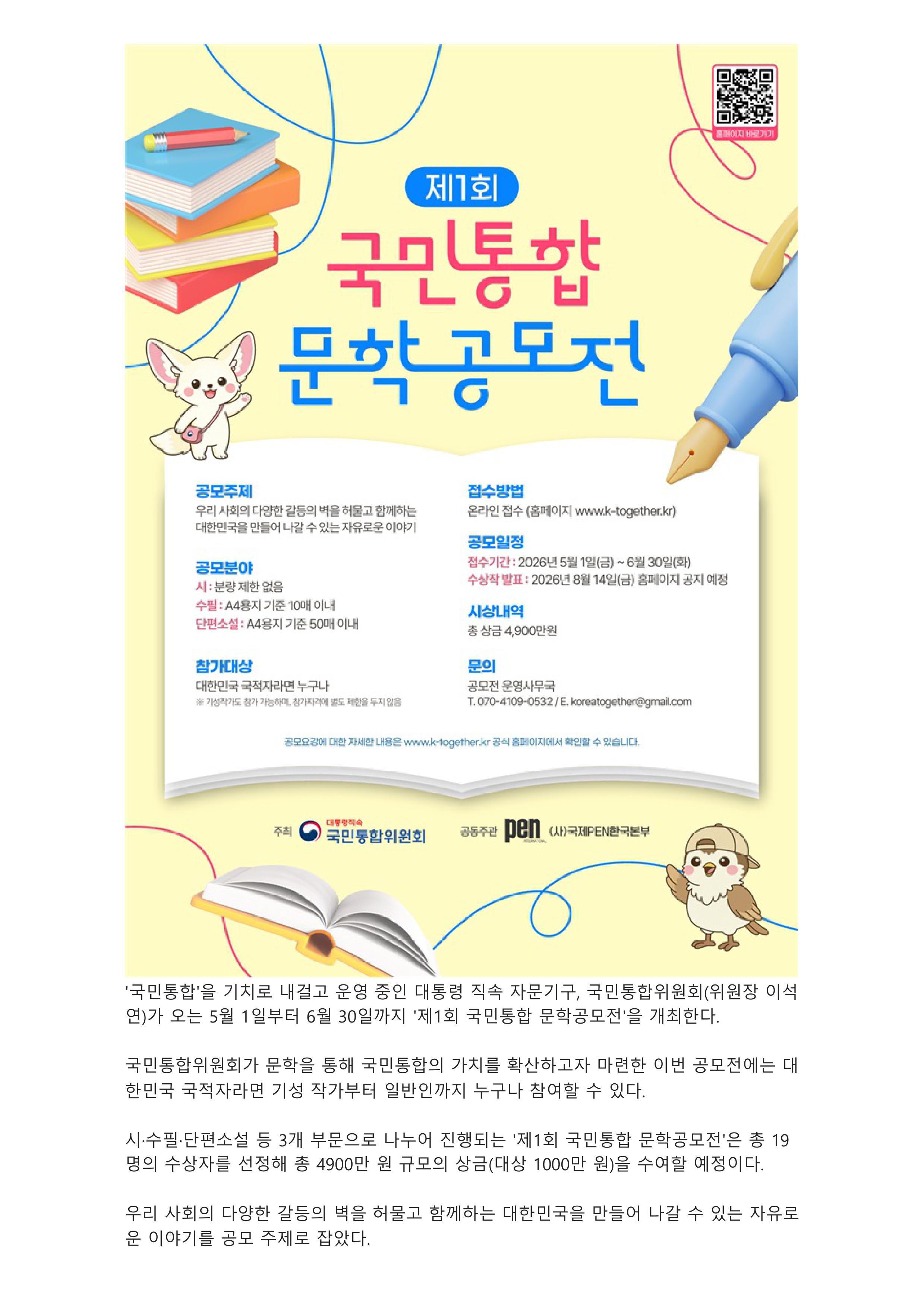 국민통합위원회 2026 제1회 「국민통합 문학공모전」 개최